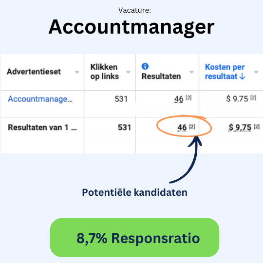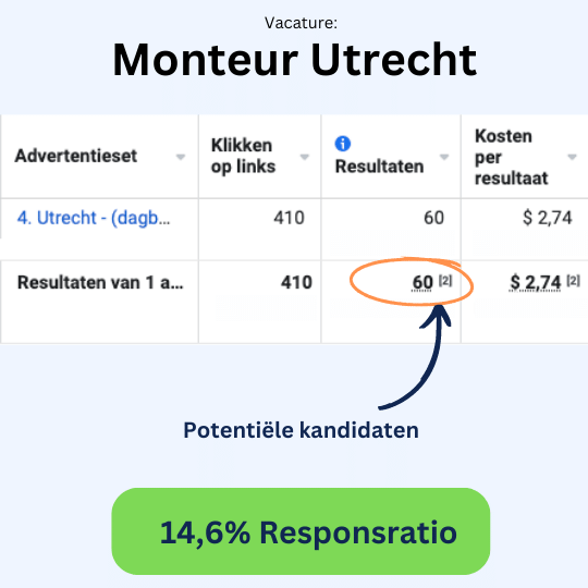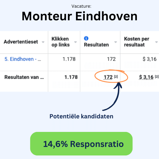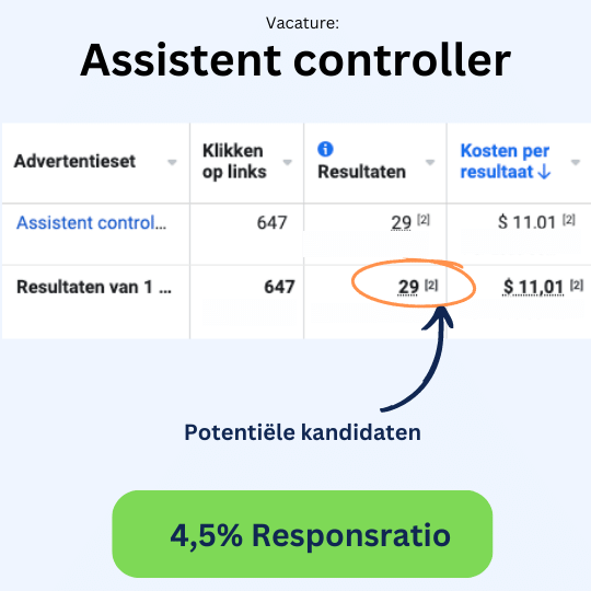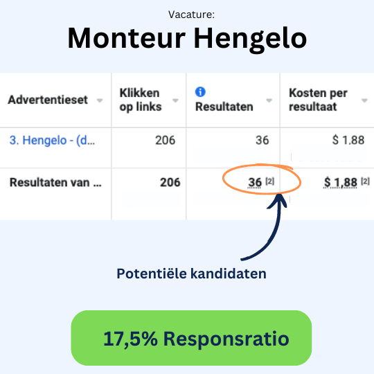 Naast vacatures voor nieuwe monteurs, hadden we ook enkele openstaande posities voor kantoormedewerkers. Hieronder tref je de resultaten aan van de social media campagne. Bij elke afbeelding is een schermafbeelding opgenomen van de resultaten, evenals de responsratio. Het is goed om op te merken dat deze ratio’s per vacature kunnen variëren; voor complexere functies ligt de responsratio vaak wat lager.