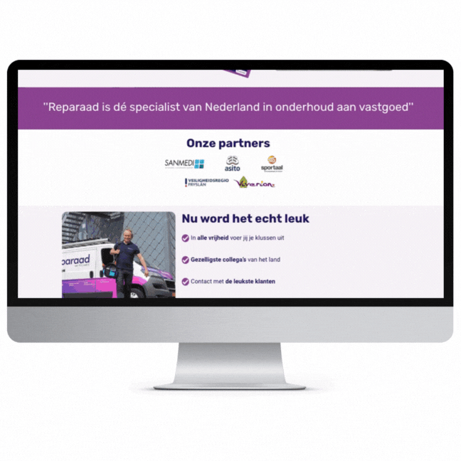 Deze website legt sterk de nadruk op visuele voorstellingen van het werk bij Reparaad, met als doel potentiële sollicitanten aan te moedigen om te solliciteren. We hebben strategisch geplaatste knoppen toegevoegd en het sollicitatieproces zo gebruiksvriendelijk mogelijk gemaakt.