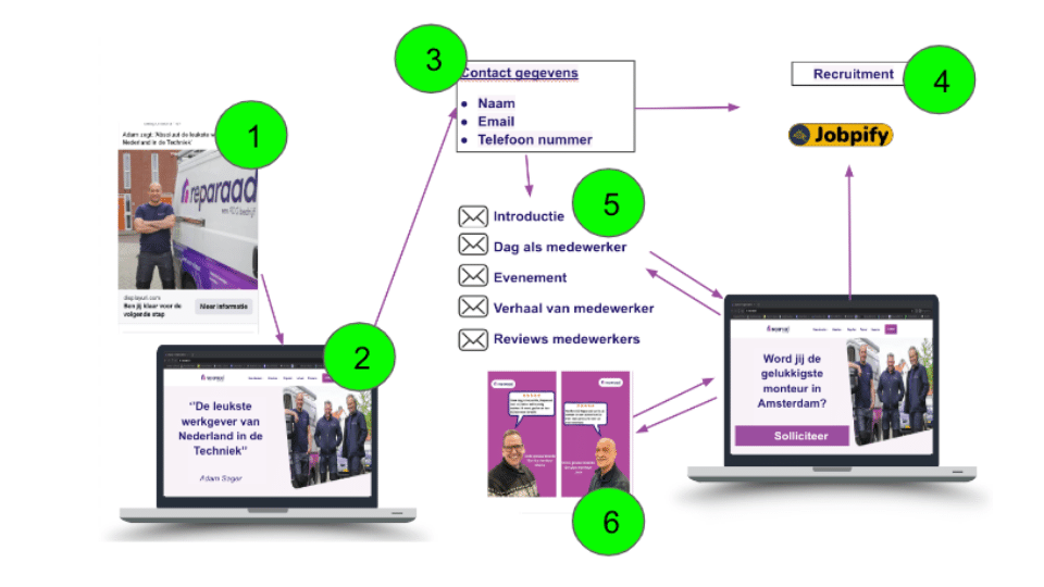 Zodra een kandidaat zijn of haar gegevens invult, wordt deze opgenomen in een e-mail automatiseringssysteem. Dit betekent dat de kandidaat in de daaropvolgende week een reeks e-mails zal ontvangen om Reparaad beter te leren kennen: